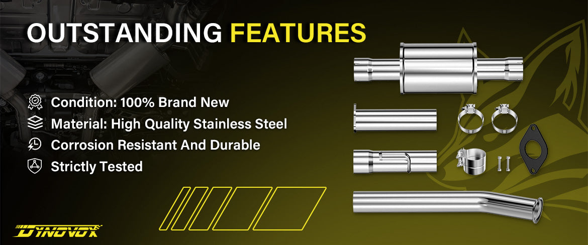 The DynoVox 4-inch Exhaust is made of high quality T-409 stainless steel with a thickness of 2 mm. It is rigorously tested for corrosion resistance and durability to ensure long term stable operation. The aluminized silver finish is not only aesthetically pleasing, but also provides excellent performance.