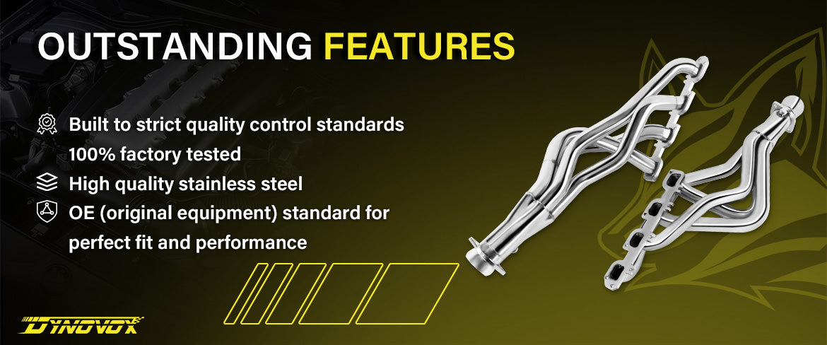 The Exhaust Long Header for 2009-2018 Dodge Ram 1500 Hemi 5.7L (Silver Polished) from DynoVox is designed to enhance engine performance by reducing exhaust backpressure. Made from durable, polished stainless steel, this high-quality header improves exhaust flow, increasing horsepower and torque. It is engineered for an exact fit, offering a bolt-on installation that ensures a quick and easy upgrade. Perfect for drivers seeking to optimize engine efficiency, throttle response, and overall performance while maintaining a sleek, polished appearance. Increase your power output and enjoy better driving dynamics.